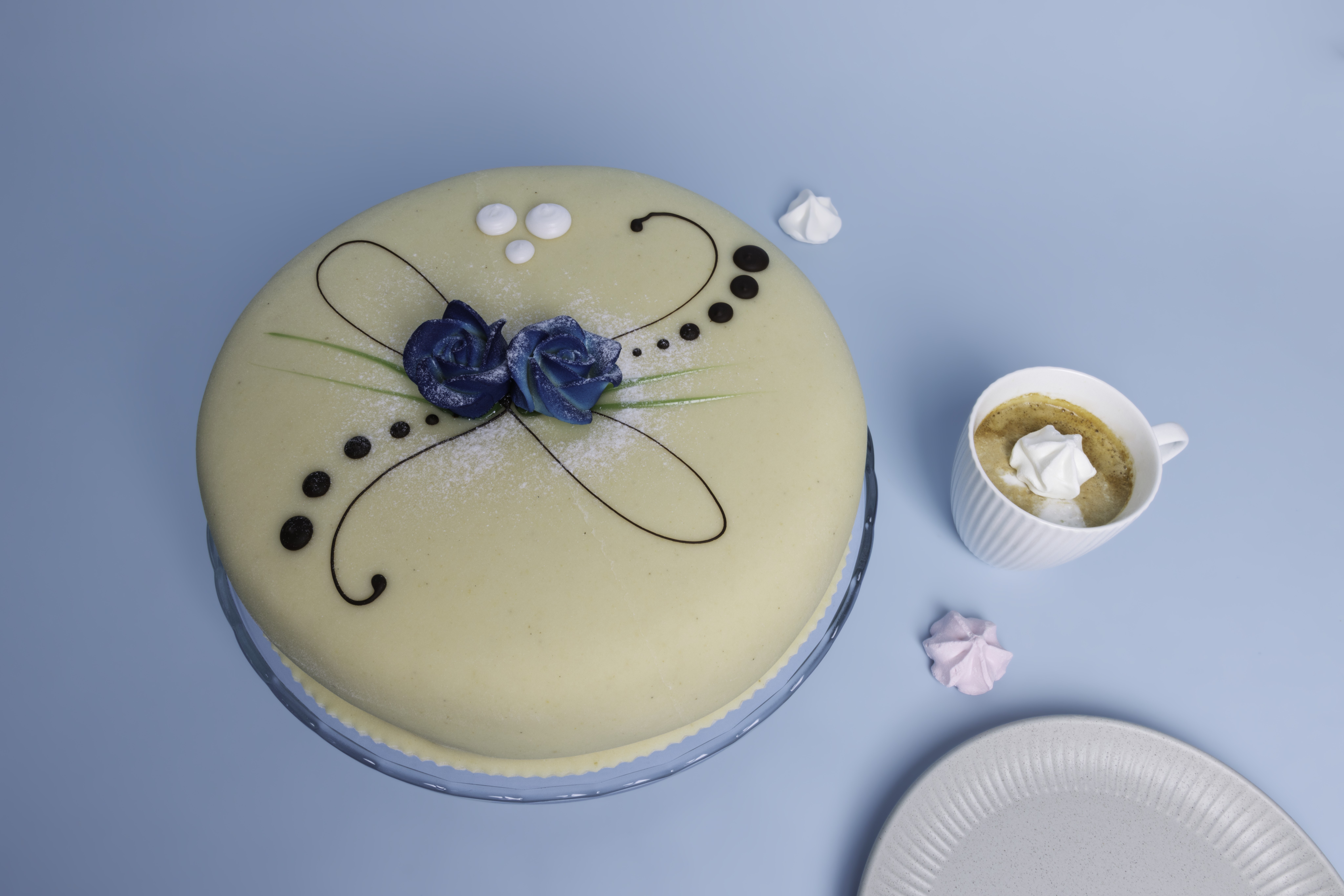 Denne marsipankaken med laktosefri fløtekrem og syltetøy passer til alle anledninger. Kaken er med standard fyll og pynt.